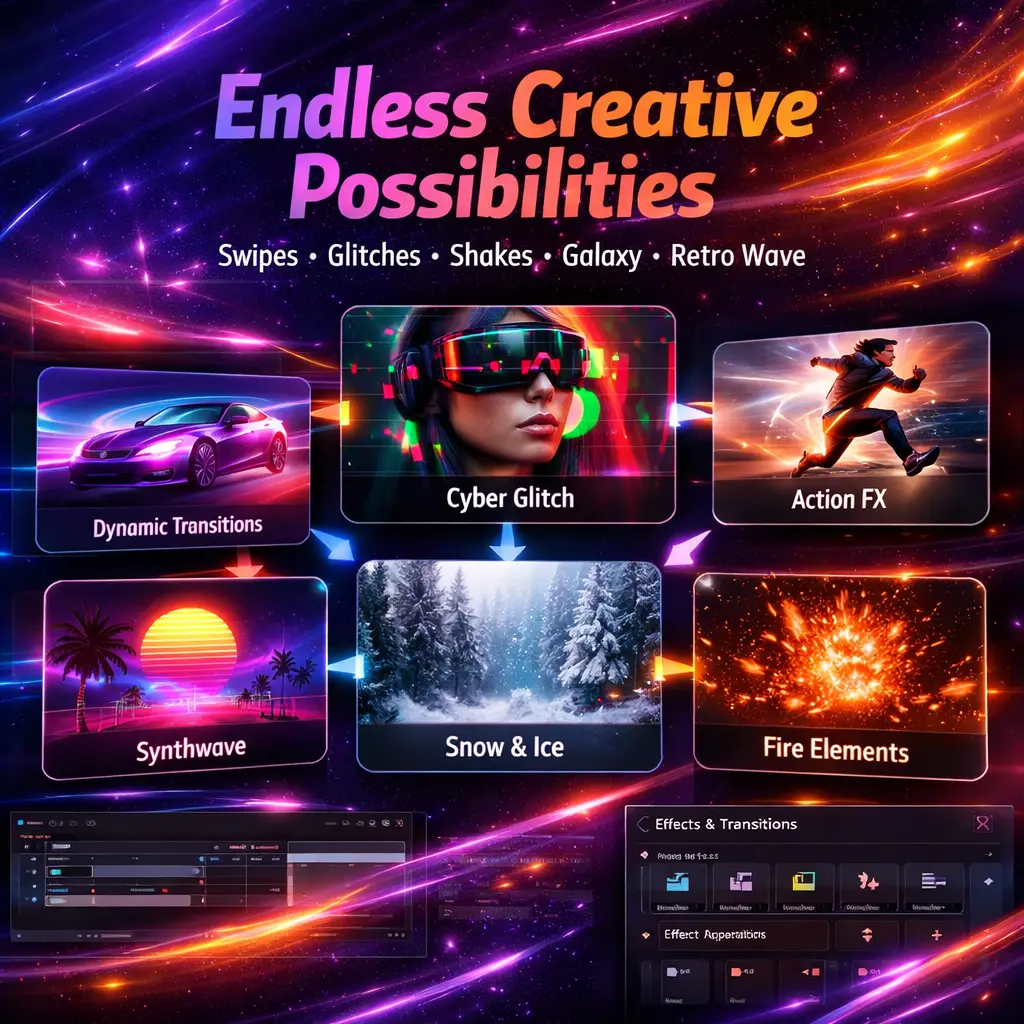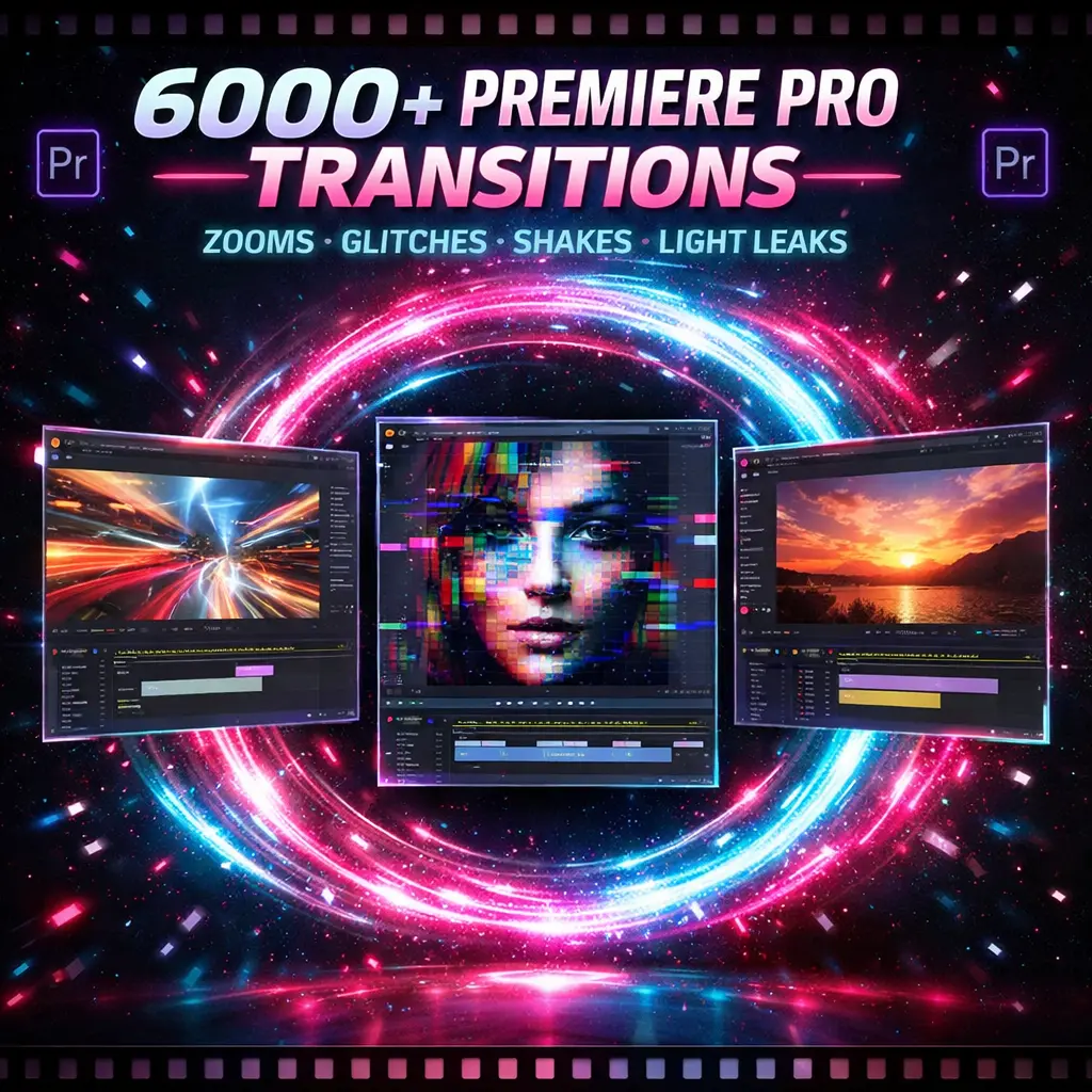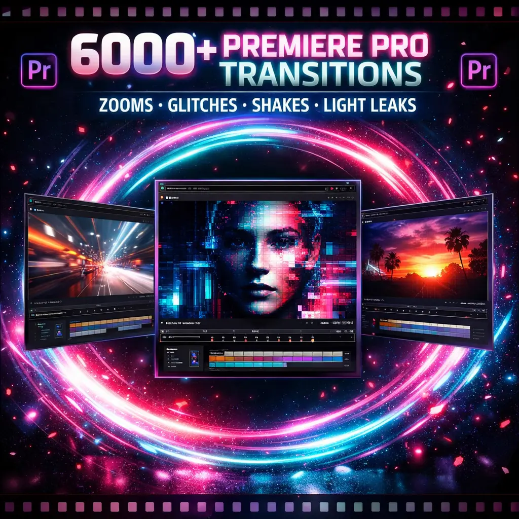 This all-in-one package combines over 6,000 transition effects, sound effects, and photo/video overlays to give your projects a professional, cinematic look. Perfect for YouTube, social media content, music videos, promos, and any video project you can imagine.